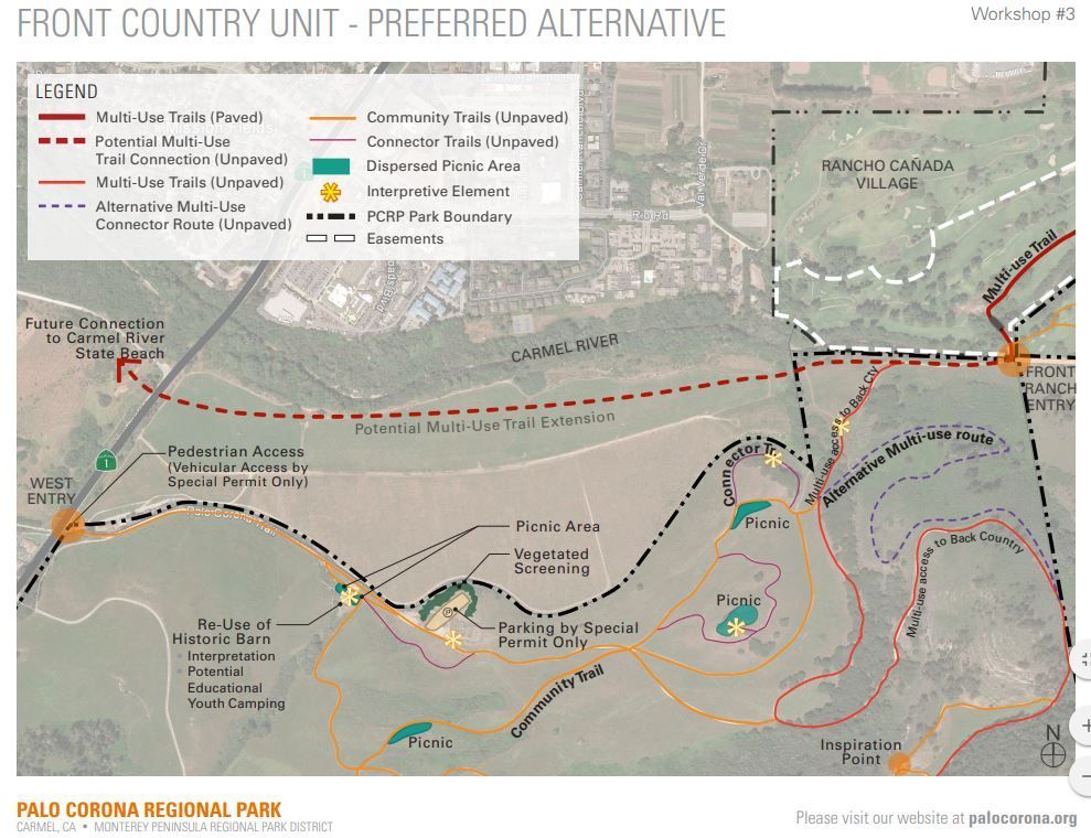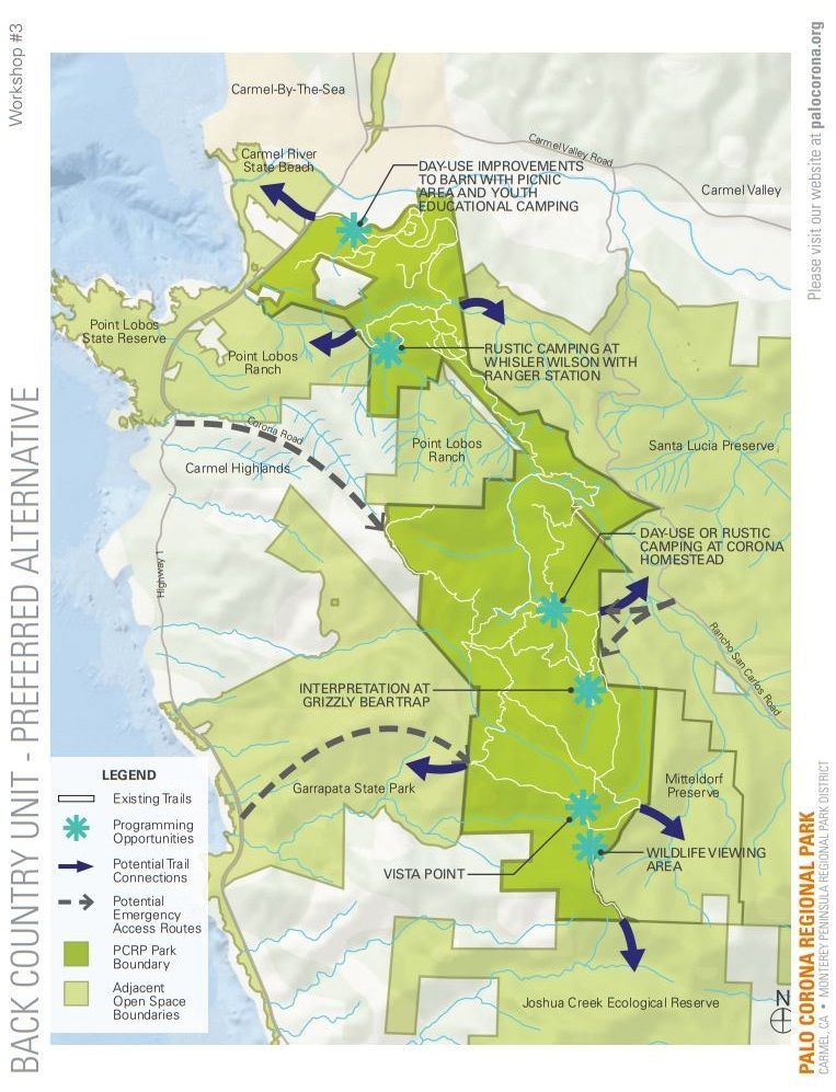 The Rancho Cañada Unit’s trails will connect with the existing Southbank Trail, may provide access to the Big Sur Land Trust’s Odello East (formerly Mr. Eastwood’s farm, immediately east of Highway 1), and Palo Corona’s units which the district calls the "Front Ranch" and “Back Country.”