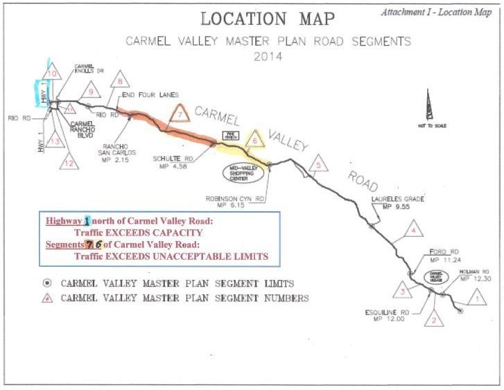 The January 29, 2015 CVA Bulletin carried a statement that CVA had presented to the County Board of Supervisors in response to the 2014 annual County report on Carmel Valley Road (CVR). Some additional details might be useful to Carmel Valley residents. Four of the five two-lane segments of CVR between Esquiline Road and Rancho San Carlos Road are near the traffic volume limits set for them in the Carmel Valley Master Plan (CVMP); for easy reference, the five are numbered