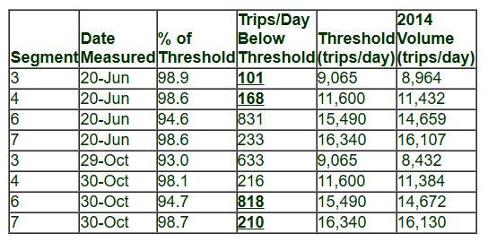 daily traffic volumes. The first four rows represent data collected in June of 2014 on relevant CVR segments (3,4,6,7), and the final four rows are for October on the same segments; the only segments considered relevant are those that have a reasonable likelihood of undergoing significant environmental impacts from potential new development.